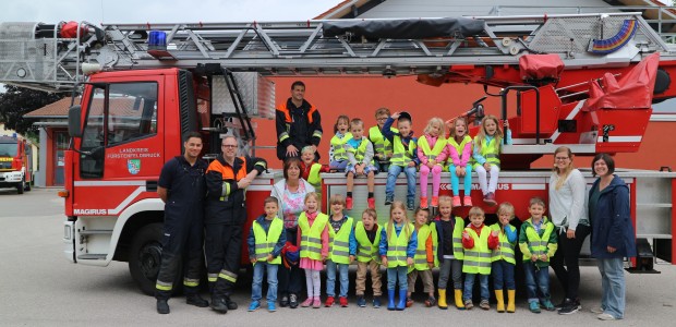 Die „Schmetterlingsgruppe“ des Kindergarten Himmelszelt mit der Leitung Babsi Blum, sowie Simone Dölle und Irmi Lunglmeir und die Feuerwehrmänner Patrick Biefel, Wolfgang Blum und Christian Huber