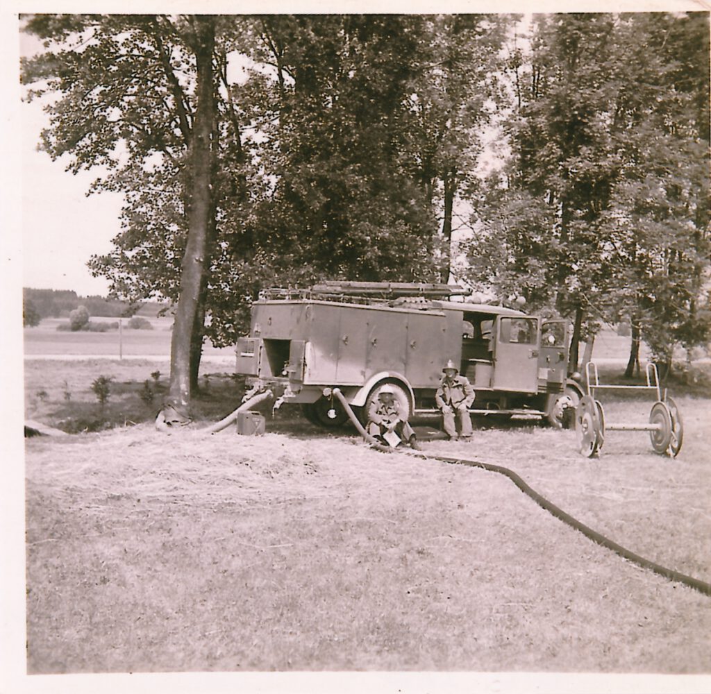 Am 15. Juli 1945 Nachmittags um 2 Uhr mußte auf Befehl des örtlichen Kommandeurs der Besatzungstruppen eine Obung beim Anwesen Maugg durchgeführt werden. Löschzug (LF 15) war bei oberer Kirche, Magirus (Motorspritze) war bei Spannruft Martin. 5 Rohre waren eingesetzt, die Obung klappte vorzüglich. Der Offizier sprach seine Anerkennung aus.